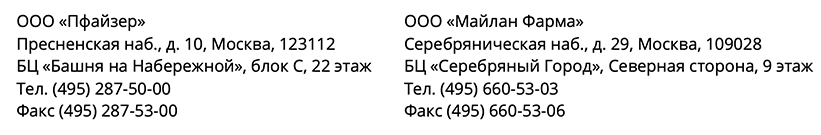 Обращаем Ваше внимание, что в настоящий момент интересы компании Viatris в РФ представлены двумя юридическими лицами ООО «Пфайзер» и ООО «Майлан Фарма». Обо всех изменениях Вы будете дополнительно проинформированы.