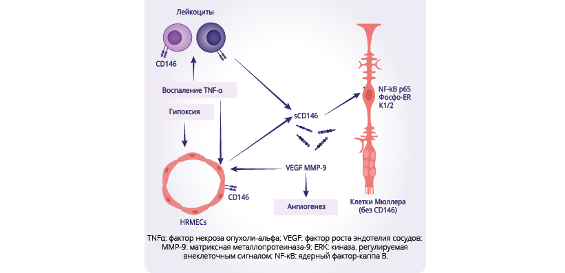 Рисунок A. Молекулярные взаимодействия в регуляции продукции sCD146 эндотелиальными клетками микрососудов сетчатки человека (HRMEC) и его влияние на глиальные клетки Мюллера сетчатки при включении ангиогенных сигналов.